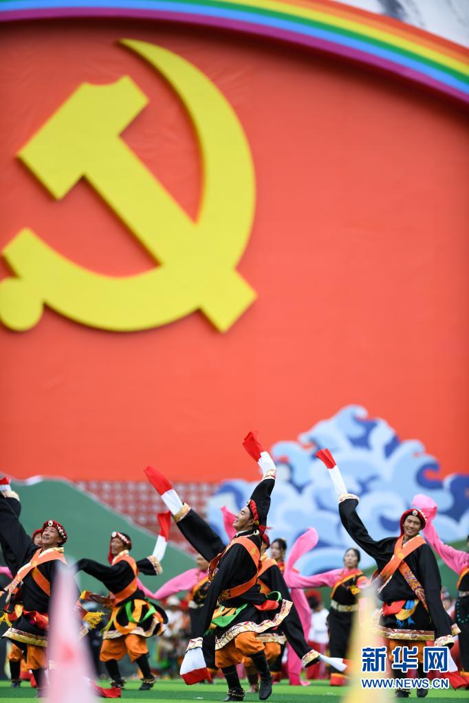 8月4日,當(dāng)?shù)厝罕娫谟駱洳刈遄灾沃莩闪?0周年慶祝大會上表演節(jié)目。新華社記者 吳剛 攝