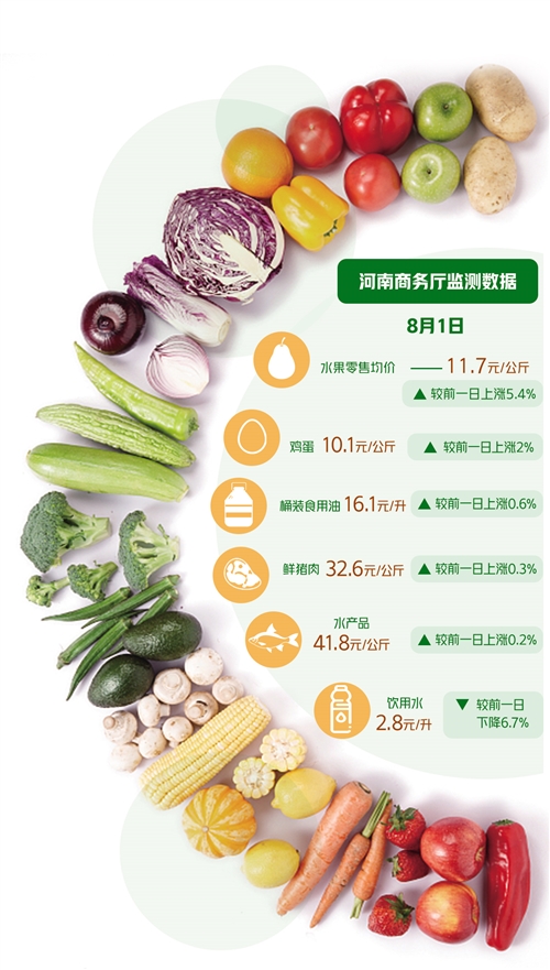 據(jù)了解,河南省商務廳自7月21日起便啟動了生活必需品市場監(jiān)測日報,對河南全省220家樣本企業(yè)、11個大類、72個品種商品實施監(jiān)測。8月1日監(jiān)測數(shù)據(jù)顯示,72個品種較前一日相比呈現(xiàn)“36漲14平22降”。分大類看,水果零售均價為11.7元/公斤、雞蛋10.1元/公斤、桶裝食用油16.1元/升、鮮豬肉32.6元/公斤、水產(chǎn)品41.8元/公斤,較前一日分別上漲5.4%、2%、0.6%、0.3%、0.2%;飲用水2.8元/升,較前一日下降6.7%;糧食5元/公斤、蔬菜5.7元/公斤,與前一日持平。