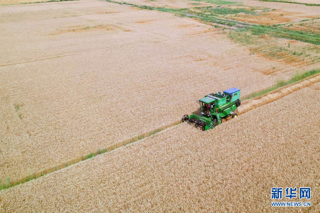 7月29日,在內(nèi)蒙古巴彥淖爾市臨河區(qū)小麥種植基地,收割機(jī)正收獲小麥(無人機(jī)照片)。新華社記者 李云平 攝
