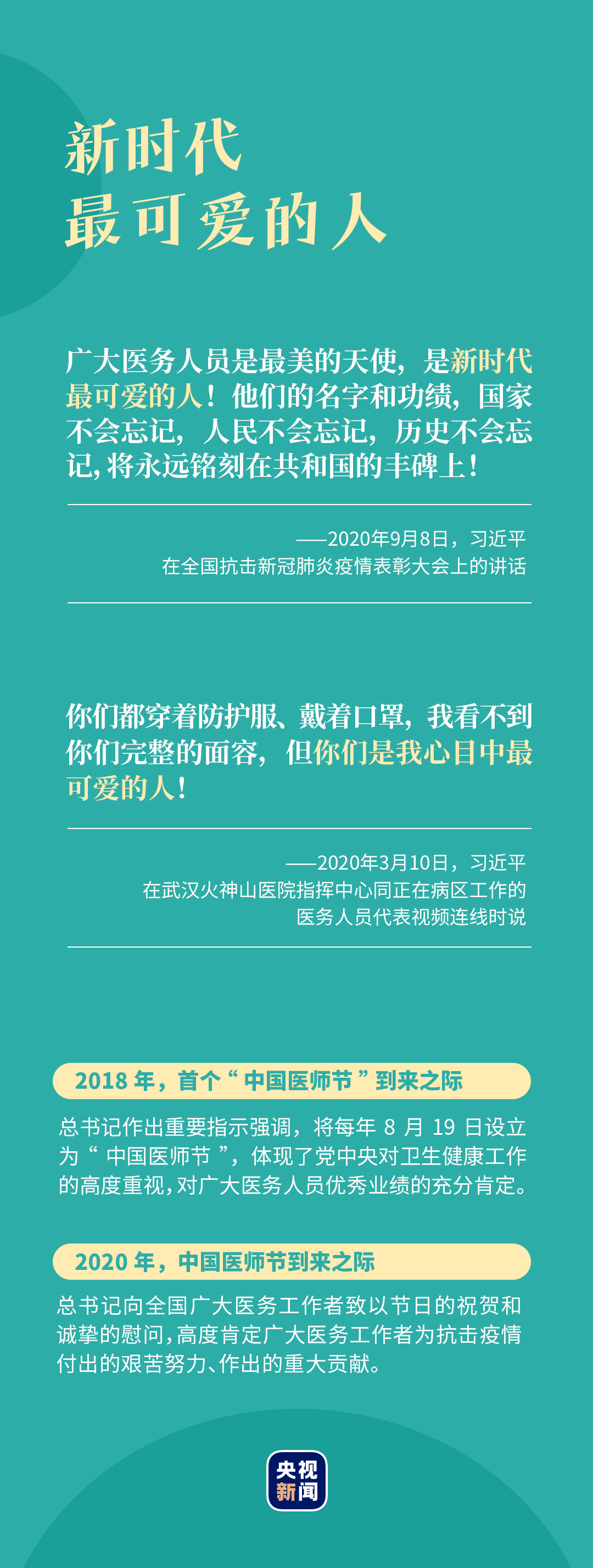 習(xí)近平總書(shū)記非常關(guān)心廣大醫(yī)務(wù)工作者,多次作出重要指示、向醫(yī)務(wù)工作者致以慰問(wèn),親切地稱(chēng)贊他們?yōu)?ldquo;新時(shí)代最可愛(ài)的人”。
