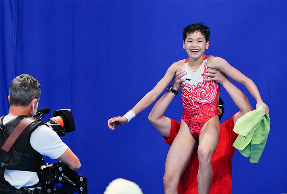 2021年8月5日,全紅嬋(上)在比賽后慶祝。當(dāng)日,在東京奧運(yùn)會(huì)跳水項(xiàng)目女子10米跳臺(tái)決賽中,中國(guó)選手全紅嬋奪得冠軍。新華社記者 許暢 攝