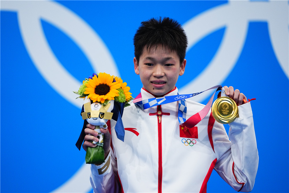 2021年8月5日,全紅嬋在頒獎(jiǎng)儀式上。當(dāng)日,在東京奧運(yùn)會(huì)跳水項(xiàng)目女子10米跳臺(tái)決賽中,中國(guó)選手全紅嬋奪得冠軍。新華社記者 許暢 攝