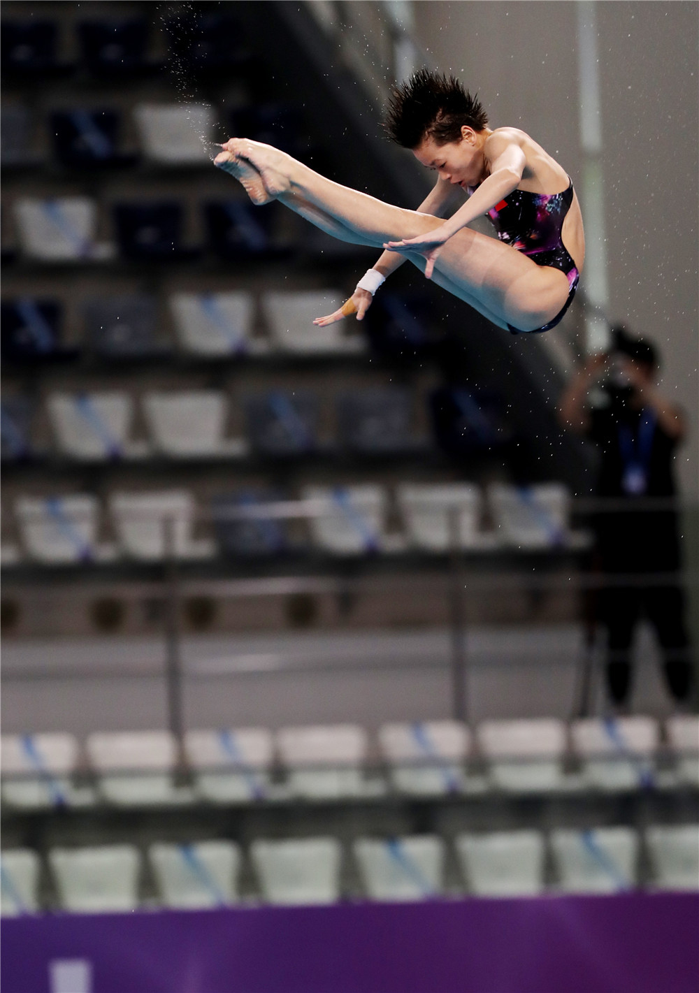 2020年10月4日,全紅嬋在比賽中。當(dāng)日,在河北奧體中心舉行的2020年全國(guó)跳水冠軍賽暨東京奧運(yùn)會(huì)、世界杯預(yù)選賽女子10米跳臺(tái)決賽中,廣東海印隊(duì)選手全紅嬋奪得冠軍。新華社記者 王曉 攝