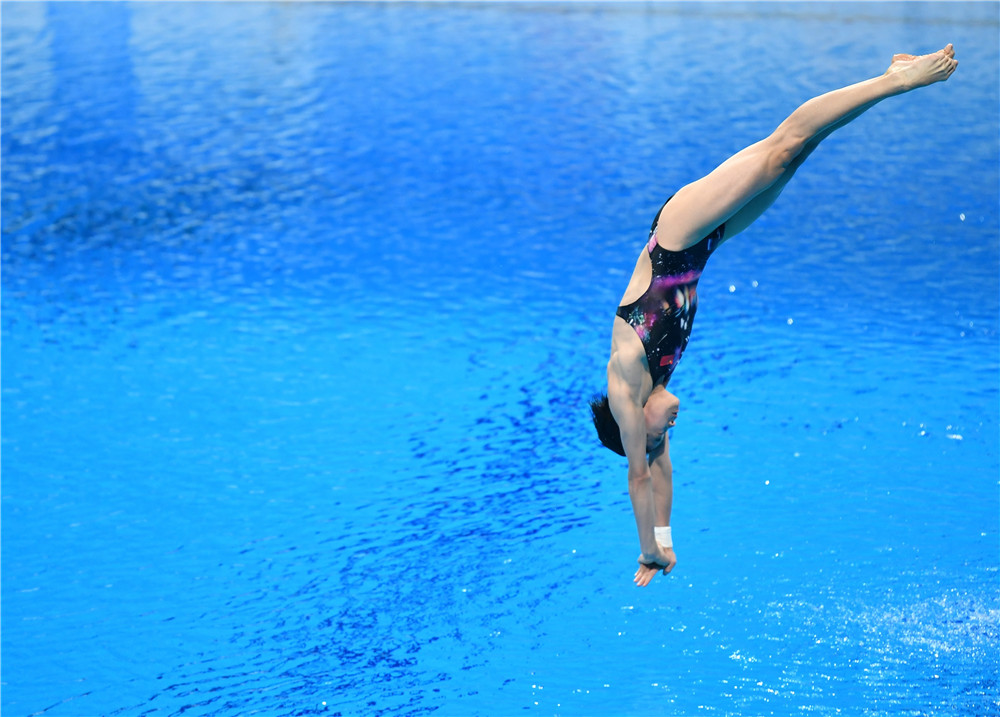 2021年8月5日,全紅嬋在比賽中。當(dāng)日,在東京奧運(yùn)會(huì)跳水項(xiàng)目女子10米跳臺(tái)決賽中,中國(guó)選手全紅嬋奪得冠軍。新華社記者 丁旭 攝