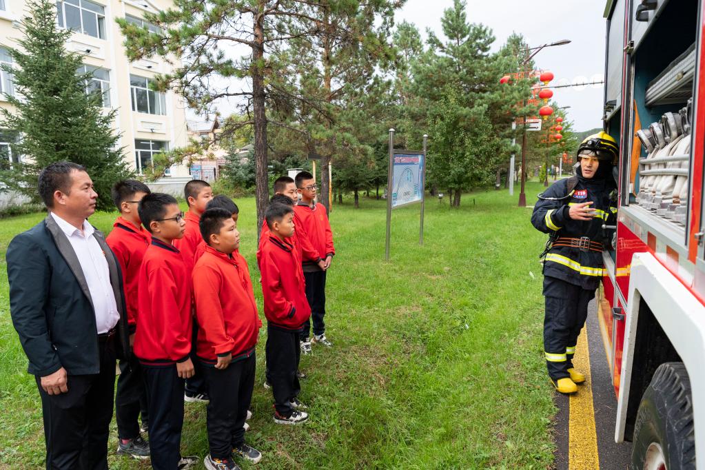 9月6日,在北極鎮(zhèn)中心學校,馬建國和學生一起上消防知識“開學第一課”。新華社記者謝劍飛 攝