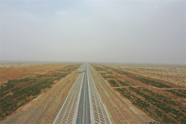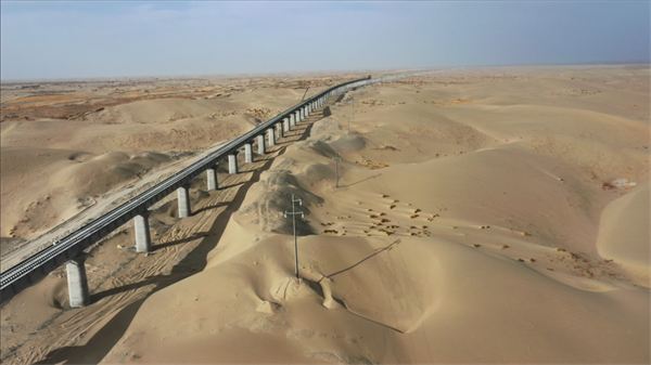 和若鐵路為國家重點鐵路建設(shè)項目,線路全長825.476公里,2018年12月開工建設(shè),連通南疆和田地區(qū)和田市與巴音郭楞蒙古自治州若羌縣。完成鋪軌的和若鐵路與現(xiàn)有格庫鐵路、喀和鐵路、南疆鐵路連通,環(huán)繞塔克拉瑪干沙漠一周,構(gòu)成世界首條環(huán)沙漠鐵路線。