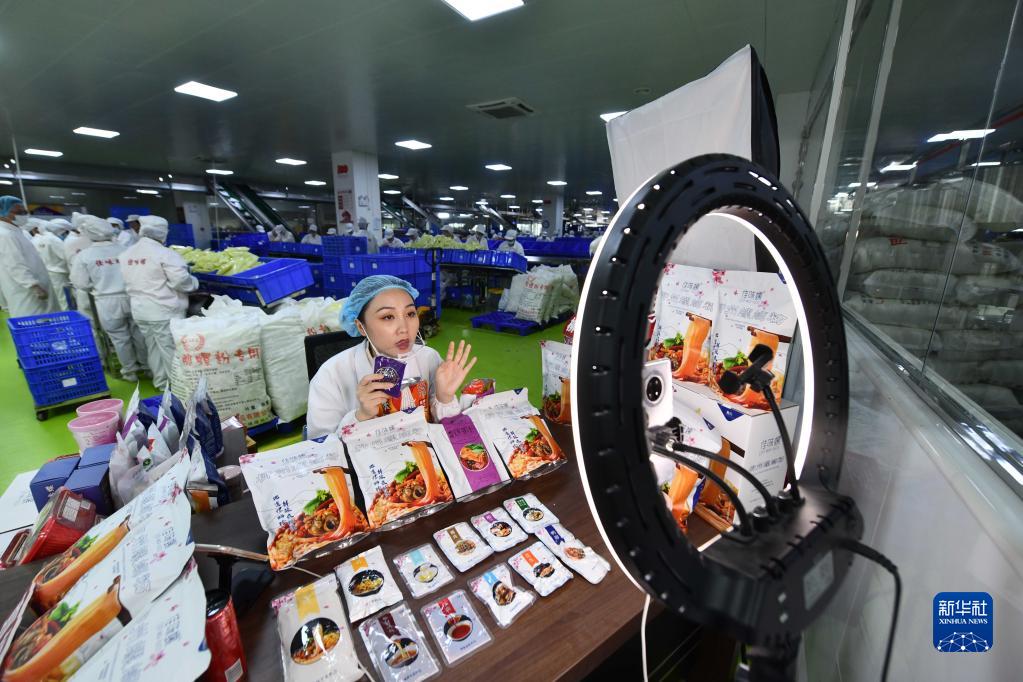 在廣西一家螺螄粉生產(chǎn)車間,工作人員在直播銷售螺螄粉(6月17日攝)。新華社記者 黃孝邦 攝