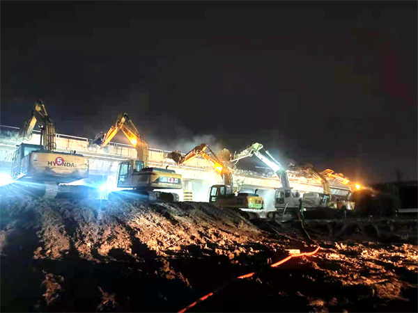 在施工現場,隨著指揮員的一聲令下,50多臺設備齊裝上陣,轟隆作業(yè)。由于該兩座橋同時上跨京滬高速公路,現場作業(yè)空間有限。為確保此次拆橋任務安全順利進行,同時降低施工影響,京滬高速公路HA4標項目部對施工現場進行詳細調查,多次組織召開專家施工方案評審會,反復論證,細化橋梁拆除方案,精準把控施工計劃;項目部領導班子和管理人員,全稱盯控,確保拆除工作萬無一失。