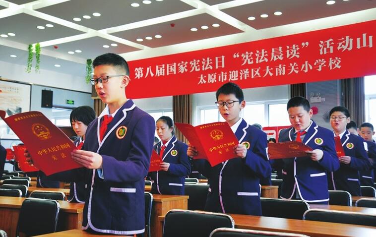 12月3日,迎澤區(qū)大南關(guān)小學開展“憲法晨讀”活動。該校作為第八屆國家憲法日“憲法晨讀”山西分會場,通過讓學生們朗讀憲法、收看直播等方式宣傳憲法知識。(徐浩軒 攝)