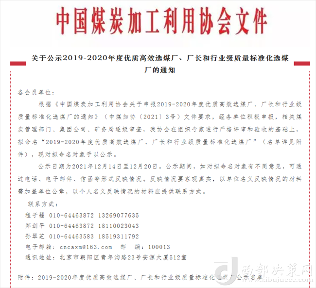 西部決策網(wǎng)訊12月14日,從中國煤炭加工利用協(xié)會傳來喜訊,陜煤集團陜北礦業(yè)檸條塔公司選煤廠榮獲2019-2020年度行業(yè)級質(zhì)量標(biāo)準(zhǔn)化選煤廠。