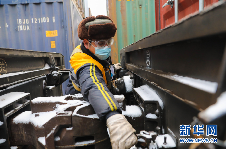 12月25日,在西安國(guó)際港站,鐵路調(diào)車(chē)作業(yè)人員正在編組中歐班列(西安)待發(fā)車(chē)輛。鐘翰林 攝