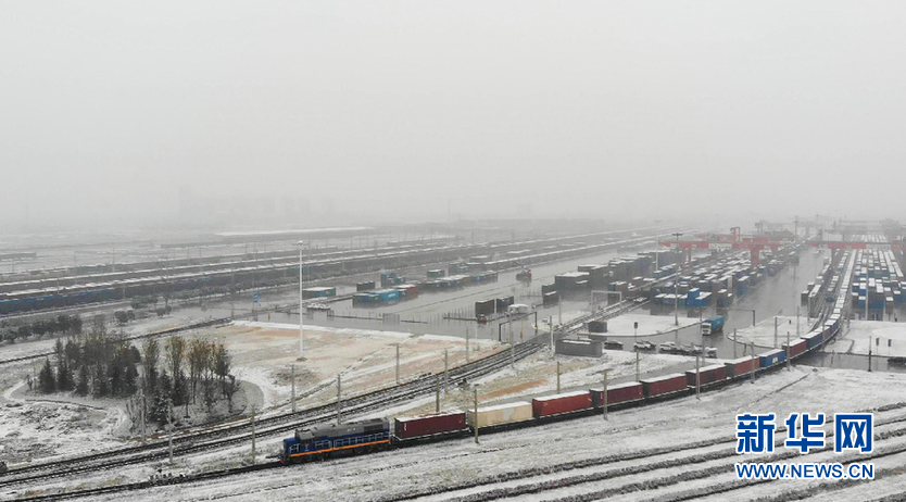 12月25日,X9003次中歐班列在雪中裝運(yùn)完畢,駛出西安國(guó)際港站。馬澤旭 攝