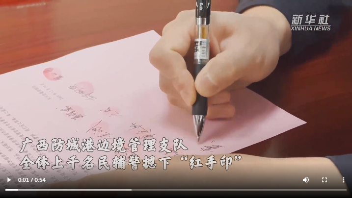 廣西防城港邊境管理支隊上千名民輔警集體遞交“戰(zhàn)疫請戰(zhàn)書”,主動要求向抗疫最前線靠攏。他們繼續(xù)選擇逆行,奔赴國門口岸、邊境卡口、村寨社區(qū),始終奮戰(zhàn)在最前線,維護檢測現場秩序,保障救援力量通行,強化邊境巡邏防控。“請戰(zhàn)書”上的一個個“紅手印”,見證忠誠。