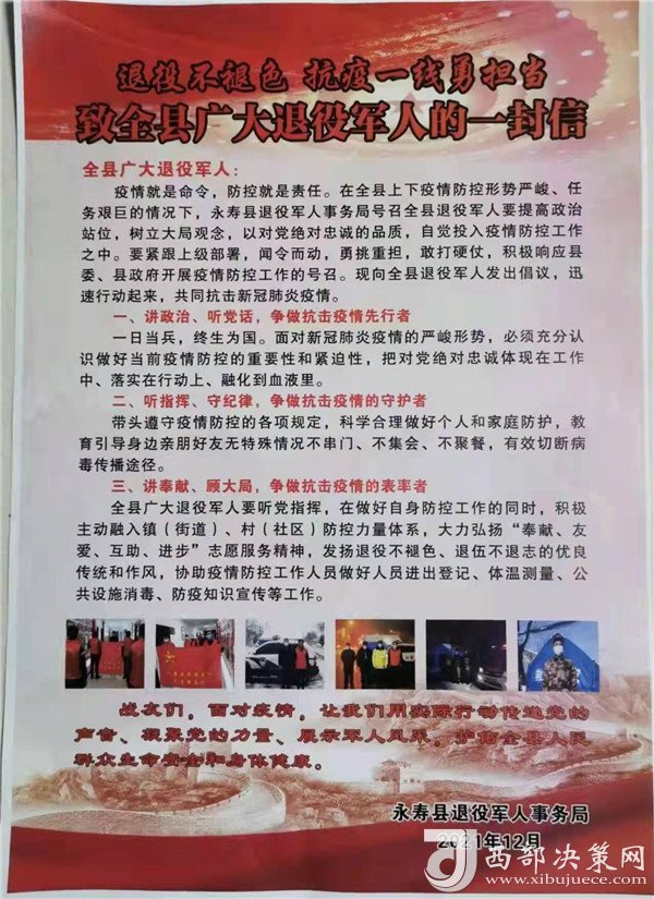 12月24日,永壽縣退役軍人事務(wù)局向全縣廣大退役軍人發(fā)出了《退役不褪色,抗疫一線勇?lián)?dāng)》的一封信,倡議一發(fā)出,志愿者們紛紛主動請纓,聯(lián)名遞交了疫情防控一線作戰(zhàn)的請戰(zhàn)書。連夜集結(jié),在永壽縣退役軍人事務(wù)局召開了“抗擊疫情沖鋒在前”退役軍人志愿者誓師動員大會,局主要負(fù)責(zé)同志向廣大退役軍人志愿者作了戰(zhàn)前動員,大家激情高漲,“必勝、必勝、必勝”的口號響徹整個大樓,用實際行動堅守在疫情防治的第一線。