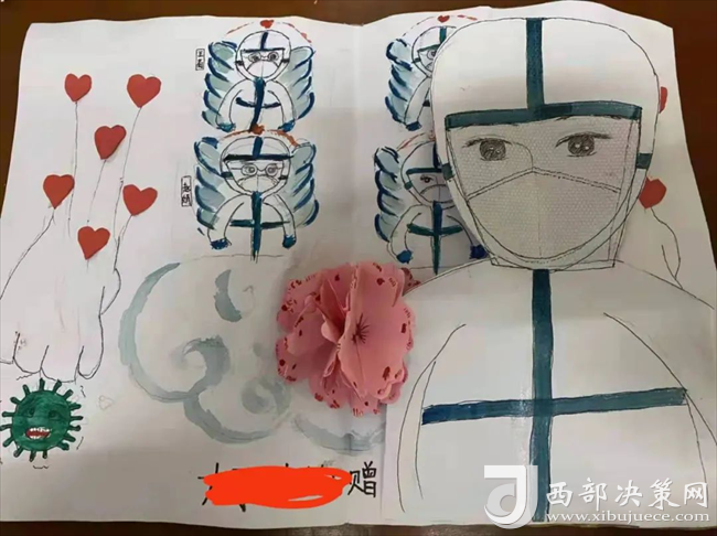 12月13日23時,第一例患者收住隔離病區(qū)?;純喝朐簳r全身感染,癥狀重,精神狀況差,哭鬧拒絕吃藥。為了安撫孩子焦慮情緒,隔離病區(qū)醫(yī)護人員輪流進入病房,陪患兒玩耍,科室安排專人,購買孩子需要的跳繩、皮筋、折紙、水果等生活用品,功夫不負有心人,經(jīng)過醫(yī)護人員耐心、細心地陪伴,孩子的情緒逐漸平靜下來,并積極配合治療,患兒最終診斷為“急性化膿性扁桃體炎、流行性感冒、急性支氣管炎”。三天后,體溫恢復正常,精神狀況明顯好轉。12月22日,患兒痊愈出院,為了表達感激之情,她動手為隔離病區(qū)工作人員送上自己精心做的一幅手工畫,向科室醫(yī)護人員敬獻一面錦旗。