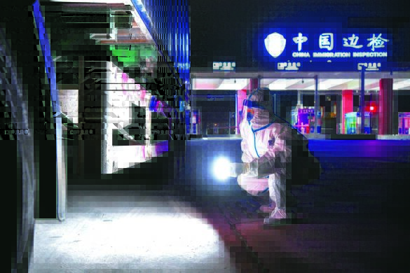 27日,記者在東興高速路口楠木山邊境檢查站看到,廣西防城港邊境管理支隊(duì)的執(zhí)勤民警身穿防護(hù)服,有條不紊地對(duì)車(chē)輛人員進(jìn)行檢查,引導(dǎo)運(yùn)送抗疫物資和人員的車(chē)輛有序進(jìn)入檢查站。