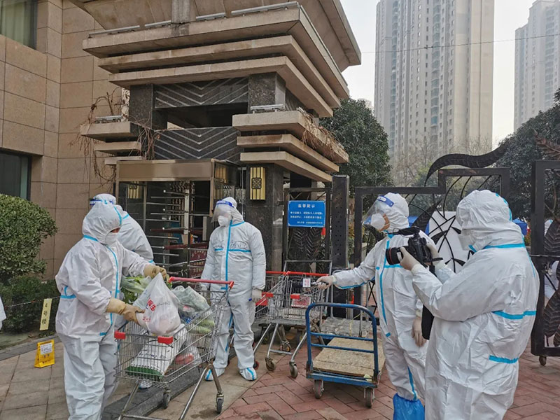 2021年12月24日,中央廣播電視總臺(tái)陜西總站記者吳成軒(右二)、攝像郭升(右一)采訪為老弱群體上門配送生活物資的社區(qū)工作人員。
