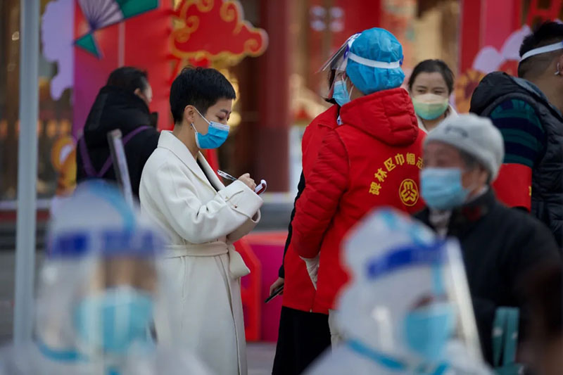 2021年12月23日,咸陽(yáng)日?qǐng)?bào)社記者李石(左)在全員核酸檢測(cè)點(diǎn)采訪。