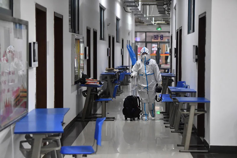 2022年1月4日,人民日?qǐng)?bào)社記者原韜雄(左一)在新冠確診病例收治點(diǎn)西安市胸科醫(yī)院采訪。