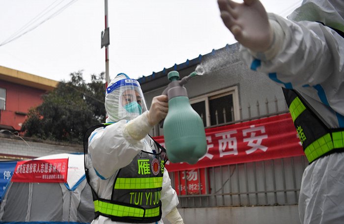 ↑1月7日,西安市雁塔區(qū)退役軍人志愿突擊隊隊員在一處核酸檢測點互相協(xié)助為防護服消毒。