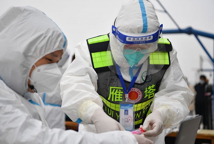 ↑1月7日,西安市雁塔區(qū)退役軍人志愿突擊隊隊員桑海鑫為核酸檢測樣本外包裝消毒。