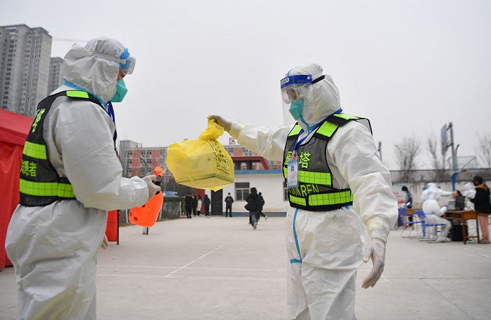 ↑1月7日,西安市雁塔區(qū)退役軍人志愿突擊隊隊員鄒浩東(右)在一處核酸檢測點與工作人員交接核酸檢測樣本。