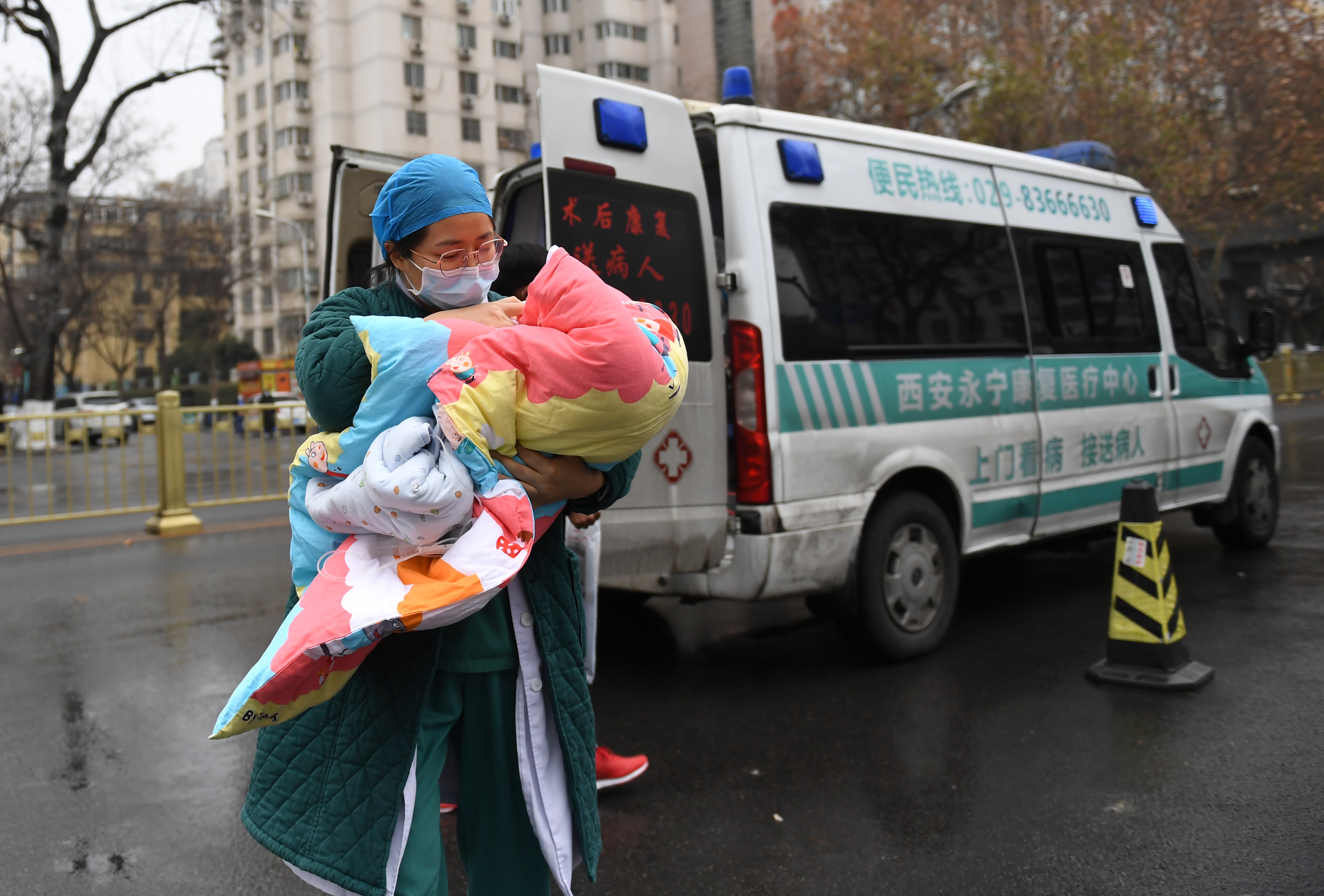 1月8日,在西安交通大學(xué)第二附屬醫(yī)院,兒科醫(yī)生王莉接診一名被救護(hù)車轉(zhuǎn)運(yùn)就醫(yī)的嬰兒。
