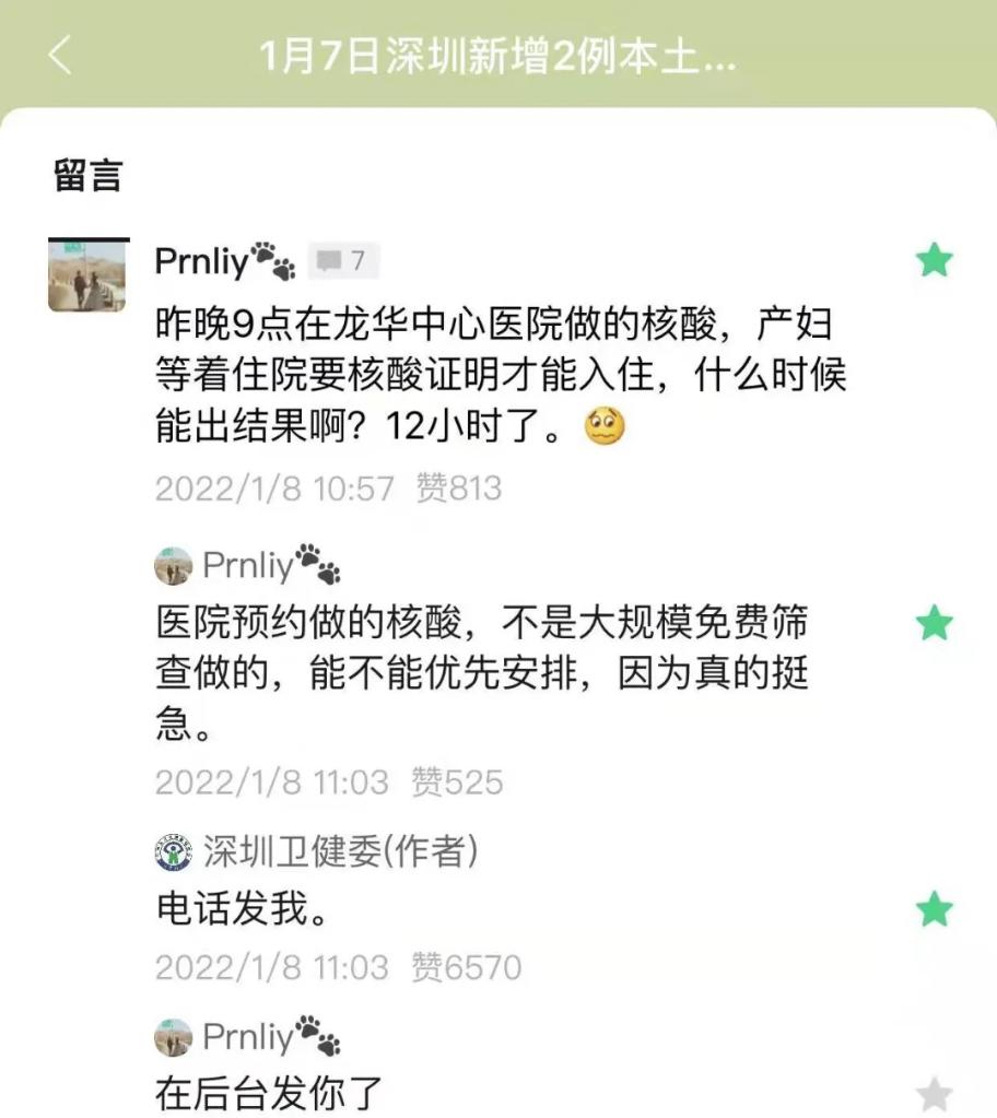 8日上午10時57分,在“深圳衛(wèi)健委”的微信公眾號推文下,一位叫“Prnliy”的網友留言,引起深圳市衛(wèi)健委工作人員的關注。這位網友說:“昨晚9點在龍華中心醫(yī)院做的核酸,產婦等著住院要核酸證明才能入住,什么時候能出結果???12個小時了。”