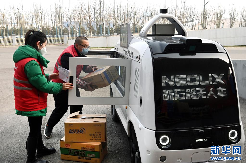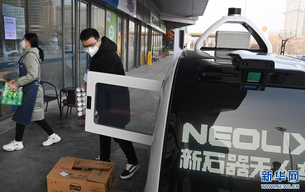 1月9日,在西咸新區(qū)灃西新城一物流中心,工作人員給無人配送車裝貨。新華社記者 陶明 攝