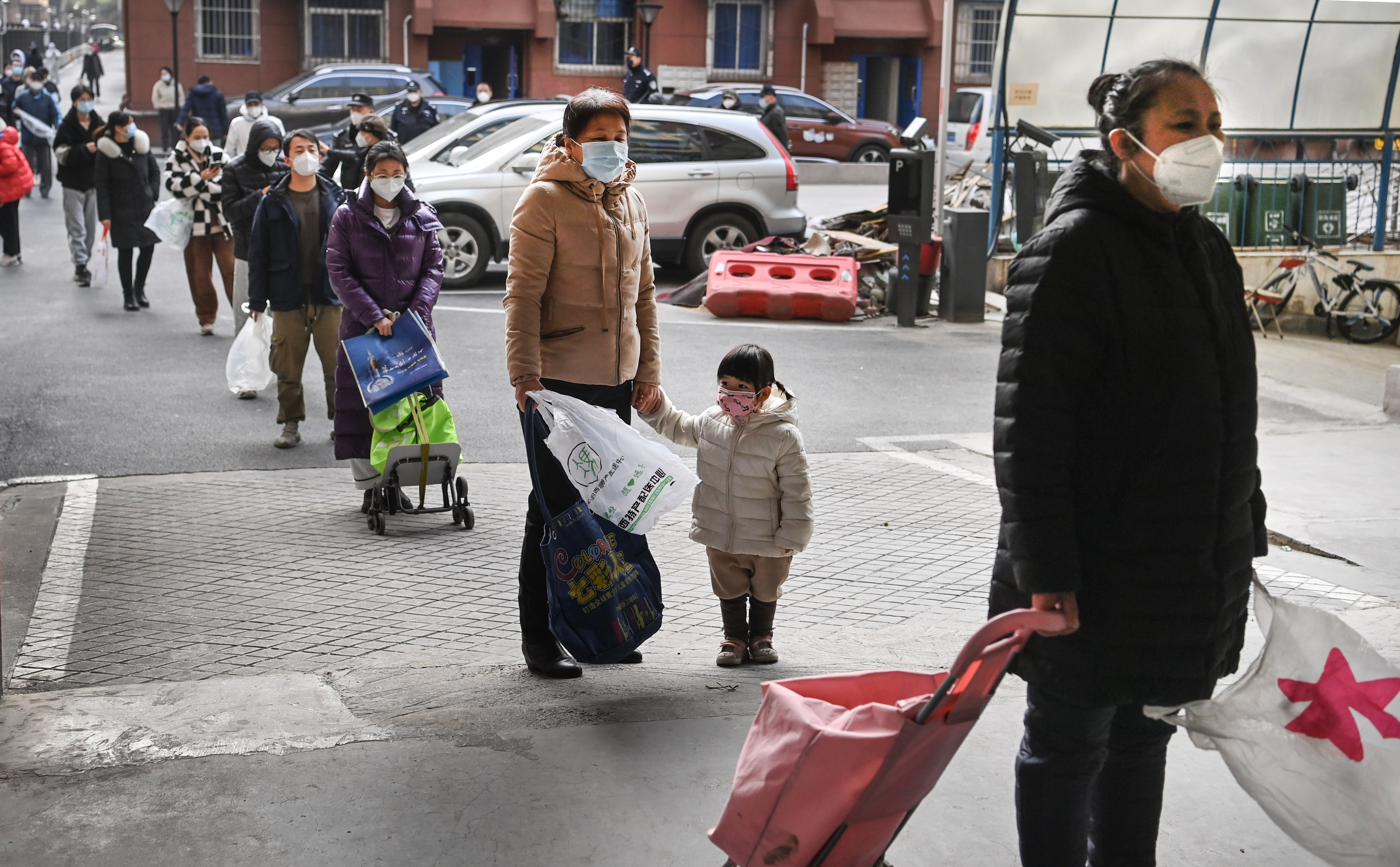 1月10日,雁塔區(qū)科技路一小區(qū)的居民排隊領(lǐng)取愛心人士捐贈的生活物資。新華社記者 陶明 攝