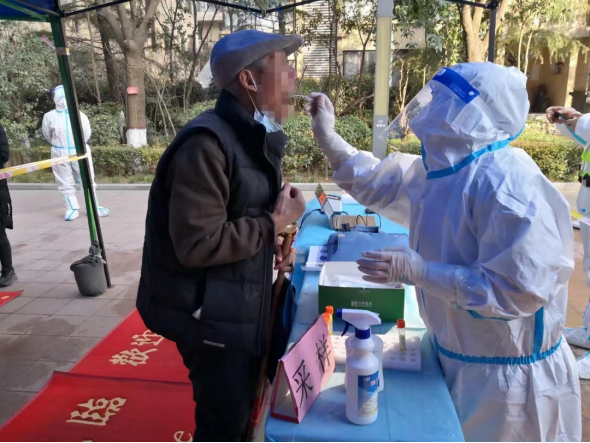 經(jīng)過星夜兼程,連夜入住酒店,開展各種培訓、考核,為釆樣工作積極準備著。12月19日,寶雞采樣隊接到的任務是支援浐灞金融園區(qū)全員的核酸釆樣工作。金融園區(qū)有將近9萬人 ,由于人口眾多,核酸釆集工作量大,時間要求緊迫,為了在規(guī)定時間內(nèi)完成釆樣任務,寶雞采樣隊的隊員早出晚歸,每天休息時間很短暫,實在太累,常常在吃飯時打個盹。冬日的西安,寒風凜冽,殘雪未消,嚴峻的疫情形勢,絲毫沒有嚇倒可愛的隊員們,反而更加喚起大家的熱血斗志。西安的夜晚很冷,零下6-7℃更是常態(tài),隊員們從不怕冷,更不叫苦,依然堅守在凌冽的寒風中,在崗位上一干就是數(shù)個小時,任務集中的時候,大家顧不上吃飯 ,穿著厚重的防護服 ,全副武裝 ,連呼吸都很困難。數(shù)個小時的連續(xù)做戰(zhàn),每個人都腰酸背痛,防護面屏上更是結(jié)起了一層薄冰 ,隊員們的手指被凍得腫脹通紅,冰冷的消毒水一遍遍刺激著隊員們的末梢神經(jīng),但這絲毫沒有影響他們工作的熱情 ,沒有一個人退縮,太冷了他們就在原地跺跺腳,大家相互加油打氣,只為凌晨的堅守和不忘初心的使命!隊員們耐心地囑咐大家張開嘴巴,發(fā)出“啊”的聲音 ,一個,兩個,三個……這樣的動作,重復了一遍又一遍。碰到年齡較小的幼童,核酸采樣人員更是顧不得地面冰涼,單膝跪地完成采樣。