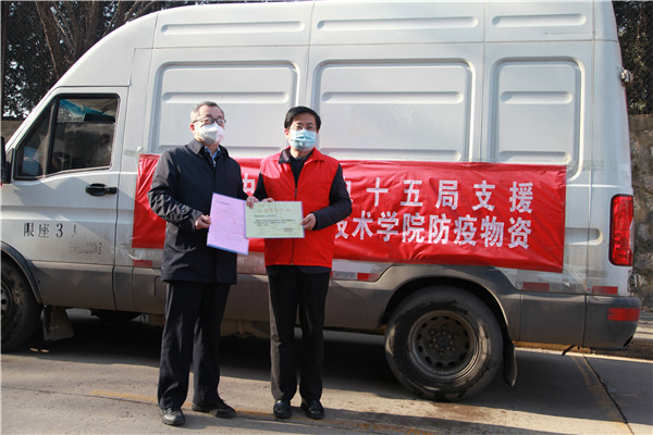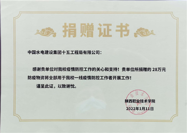 1月11日下午15:00,在陜西職業(yè)技術(shù)學(xué)院舉行簡短捐贈儀式,陜西職業(yè)技術(shù)學(xué)院黨委副書記、院長劉勝輝,黨委副書記、紀(jì)委書記何軍,副院長王慶等參加了捐贈儀式。劉勝輝代表學(xué)院黨委向我公司表示感謝,他表示,在疫情防控的關(guān)鍵時刻,水電十五局一周內(nèi)2批次送來價值近28萬元生活物資,及時緩解更極大充實(shí)和豐富了我??挂呱钗镔Y,為我院師生樹立了光輝榜樣,堅(jiān)定了共克時艱的信心和決心。何軍向公司黨委副書記、紀(jì)委書記、工會主席任志宏贈送了捐款證明和感謝信。任志宏表示,水電十五局作為駐陜央企,一直以來,堅(jiān)決貫徹落實(shí)黨中央決策部署,主動響應(yīng)陜西省委組織部和省國資委號召,面對此次疫情,將積極踐行央企擔(dān)當(dāng),履行社會責(zé)任,用實(shí)際行動為西安高校疫情防控貢獻(xiàn)一份力量!