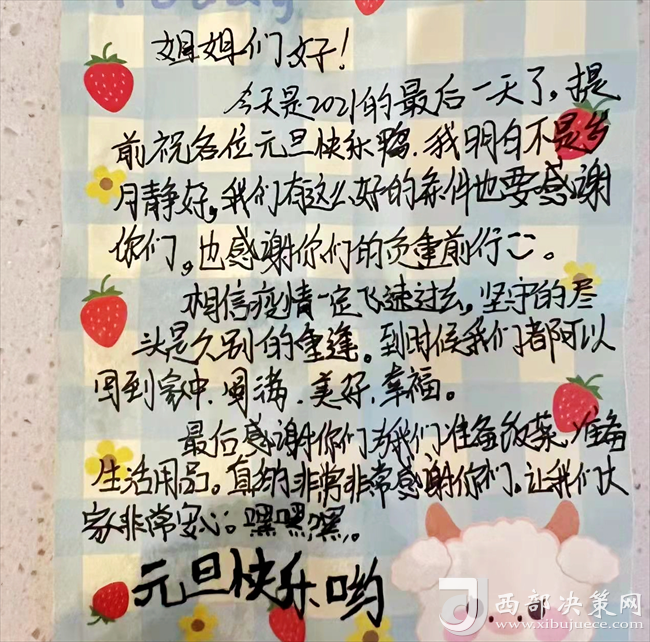 12月31日晚,即將迎來我國傳統(tǒng)佳節(jié)元旦。隔離學(xué)生怡忻悅通過手機(jī)向田甜發(fā)來了一張留言卡片,“姐姐好!今天是2021年的最后一天了,提前祝大家元旦快樂。我明白不是歲月靜好,我們有這么好的條件要感謝你們,感謝你們的負(fù)重前行。相信疫情一定飛速過去,堅守的盡頭是久別的重逢,到時候我們都可以回到家中,圓滿、美好、幸福。最后感謝你們?yōu)槲覀儨?zhǔn)備飯菜,準(zhǔn)備生活用品,讓我們大家非常安心。”學(xué)生們一句句發(fā)自肺腑、情真意切的心里話在這數(shù)九寒天里溫暖和鼓舞著每一名后勤保障人員,讓大家的疲憊一掃而空,渾身充滿了干勁和戰(zhàn)勝疫情的巨大信心。