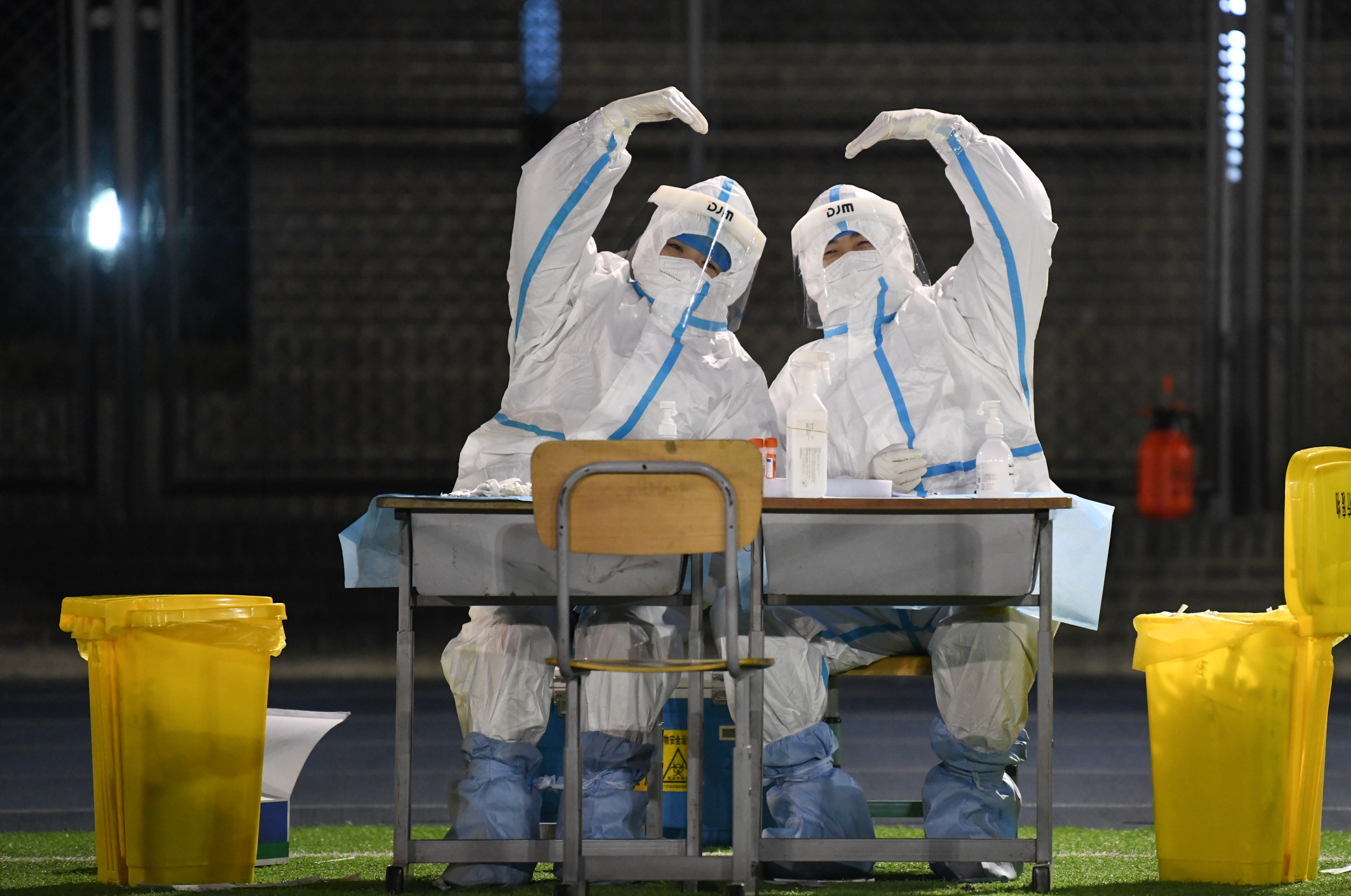 2022年1月10日凌晨,在天津市南開區(qū)鼓樓街道中營小學(xué)核酸檢測點,兩名醫(yī)務(wù)人員做出“比心”手勢。新華社記者 孫凡越 攝