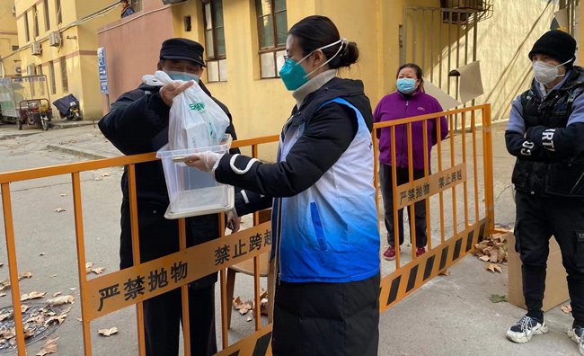 志愿者將藥品送到患者小區(qū)門口。陜西省第二人民醫(yī)院供圖