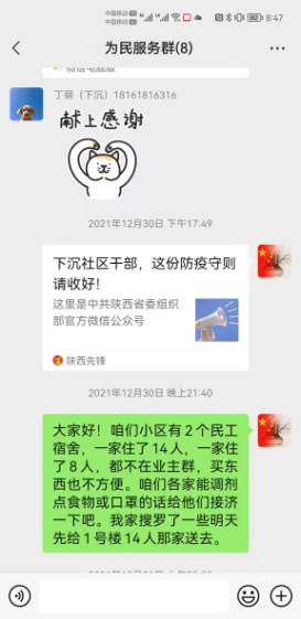 看著手里拎的幾顆白菜、蘿卜、西紅柿,我感到慚愧難當(dāng),作為一名黨員、一名下沉干部,實在是失職,沒有履行好“民之所憂,我必念之;民之所盼,我必行之”的使命擔(dān)當(dāng)。投送完愛心菜到家后,我立即在群里倡議小區(qū)下沉干部對1-3-2302的務(wù)工人員開展愛心救助活動,并從自家的抗疫儲備物資里勻出了2袋子蔬菜、豆腐乳、魚醬罐頭、口罩、水果等物資,并附上了溫馨小紙條,寫上我的聯(lián)系電話,鼓勵他們堅定克服困難的信心和決心。第二天,社區(qū)領(lǐng)導(dǎo)、小區(qū)鄰居們得知情況后,紛紛伸出援助之手,不到半小時,鍋灶有了、菜刀案板有了、糧食蔬菜也都有了…,社區(qū)的慰問品也送來了。大伙不僅給他們送去了物資,更送去了關(guān)心和安慰,他們的生活起居也迅速融入了小區(qū)大家庭,業(yè)主群里每天都有人對他們噓寒問暖,他們也經(jīng)常在業(yè)主群曬他們做的川味美食。他們私下跟我說,這幾年,他們在湖北、新疆等地都遇到過疫情,但最讓他們感動的還是西安,黨和政府的細(xì)致安排、西安人民的熱情相助,讓他們在他鄉(xiāng)異地孤立無援時,第一次感到不慌了。