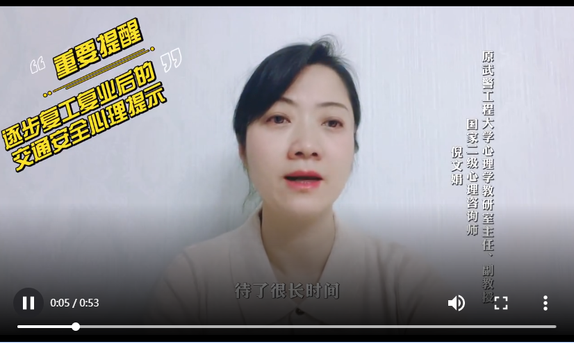 隨著西安復(fù)工復(fù)產(chǎn)的推進(jìn),“開車出門”成了恢復(fù)常態(tài)化防控之后,很多市民面臨的第一件事。今天(1月15日),西安交警邀請原武警工程大學(xué)心理學(xué)教研室主任、副教授,國家二級心理咨詢師倪文娟,提醒駕駛員在家中狹小的空間內(nèi)長時間封閉后,如何保持安全出行心態(tài)。