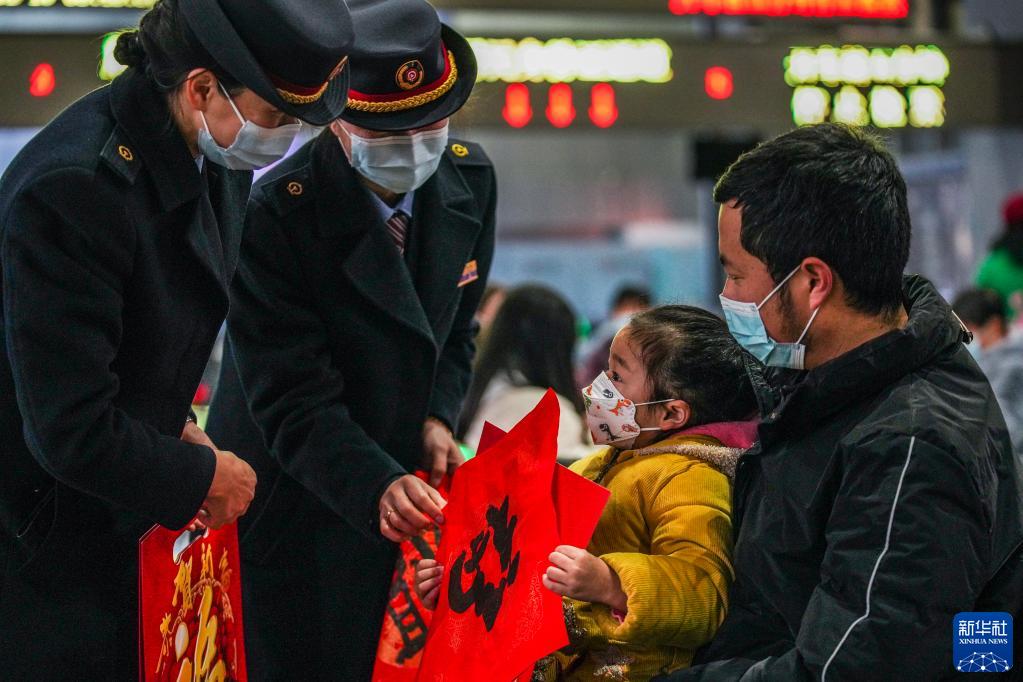 1月17日,貴陽(yáng)客運(yùn)段工作人員在貴陽(yáng)火車(chē)站為候車(chē)旅客送上福字與春聯(lián)。新華社記者 陶亮 攝