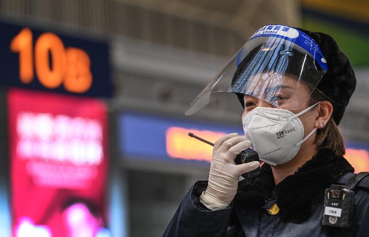 1月16日,工作人員對西安北站站臺進(jìn)行消殺。新華社記者 陶明 攝