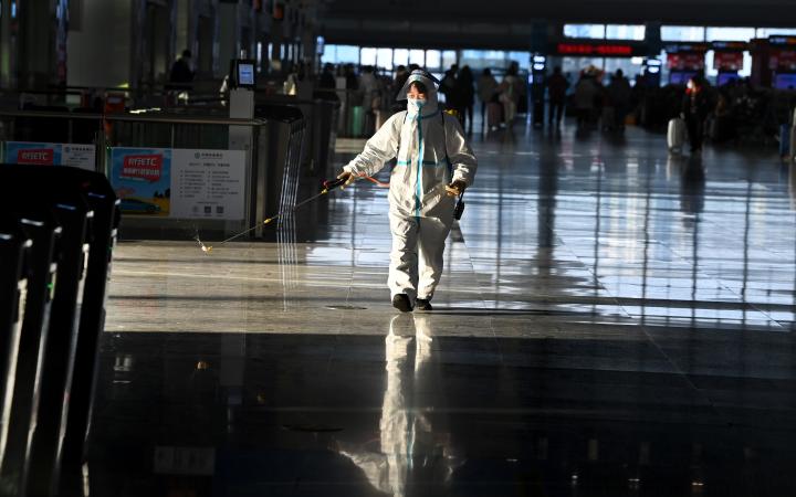 1月16日,工作人員在對西安北站候車大廳進(jìn)行環(huán)境消毒。新華社記者 陶明 攝