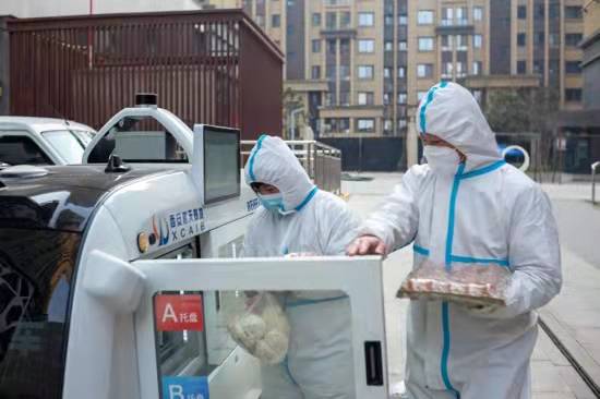 關(guān)好柜門(mén)后,白色小車(chē)便沿著設(shè)定軌道緩緩駛向附近的鳳鳴小區(qū)。穿著防護(hù)服的工作人員早已等候在指定位置,他們打開(kāi)寫(xiě)有樓棟號(hào)的柜門(mén)取出貨物,關(guān)上柜門(mén)后,小車(chē)又自動(dòng)駛向下一站……這種科技感十足的配送方式,既提高了效率,又實(shí)現(xiàn)了全程無(wú)接觸精準(zhǔn)配送。