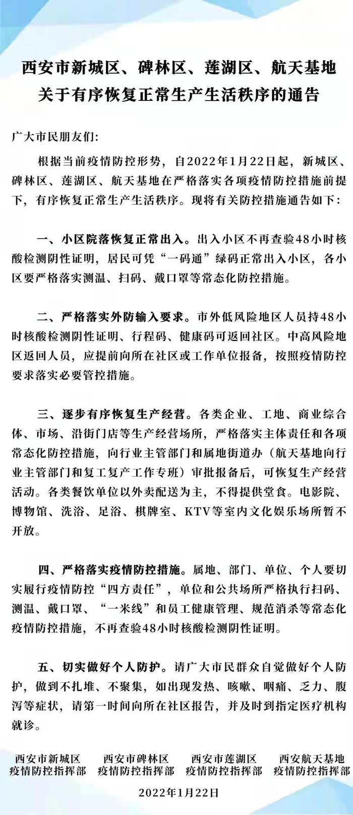 1月22日,西安市四個區(qū)域疫情防控指揮部聯合發(fā)布通告:西安市新城區(qū)、碑林區(qū)、蓮湖區(qū)、航天基地自2022年1月22日起有序恢復正常生產生活。通告全文如下: