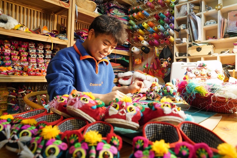 “老虎是百獸之王,是保平安的吉祥物,也是我們民俗文化中‘福’字的諧音。”夏璐璐介紹,他在設計制作虎頭帽、虎頭鞋的過程中,會使用不同的手法、材質(zhì)和造型,這也讓小老虎看起來更加可愛。
