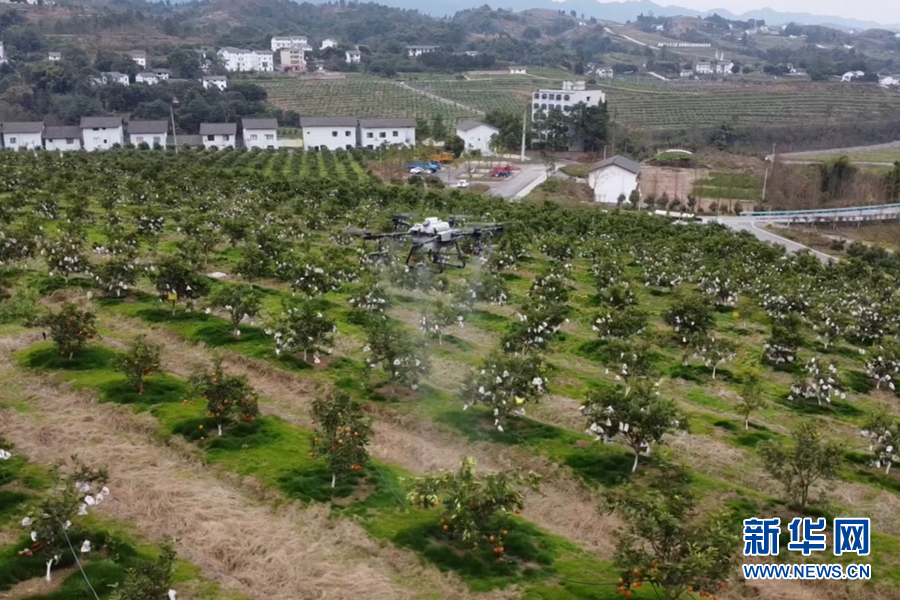 一架植保無人機(jī)正在渝北區(qū)大盛鎮(zhèn)青龍村的果園內(nèi)噴灑營養(yǎng)液。新華網(wǎng) 耿駿宇 攝