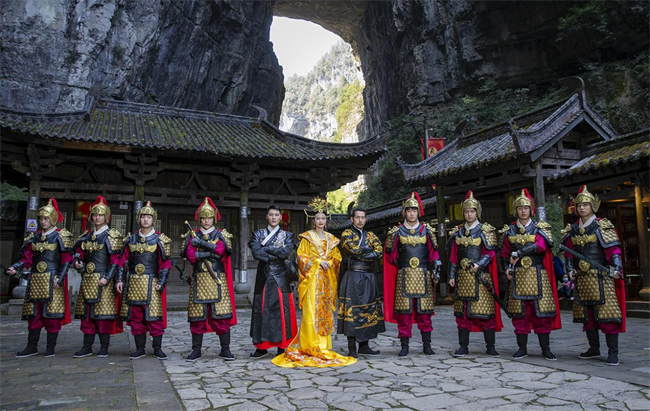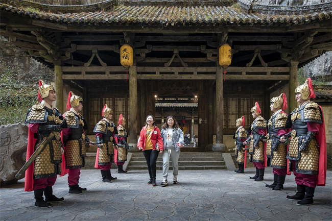 “女王駕到”“恭迎女王陛下”“諸位請(qǐng)起,游玩到此,觀景甚美,諸位與我,共享此景。”在天生三橋景區(qū)天福官驛客棧,一群身形魁梧的帶刀侍衛(wèi),整齊的站在驛站門口兩側(cè)恭迎每位入園的“女王”。現(xiàn)場(chǎng)儀式感爆棚,一身金黃的“女王”霸氣外露。驛站內(nèi)熱鬧的氛圍吸引了眾多游客參與,有的上前與侍衛(wèi)互動(dòng)拍照,有的主動(dòng)穿上“女王”服體驗(yàn)霸氣女王范,有的還主動(dòng)表演起了電影里女王翻牌的有趣橋段。“今天我最大,這樣過節(jié)著實(shí)過癮”玩得正起勁的劉女士表示,這是她過得最好玩、最具儀式感的女王節(jié)。