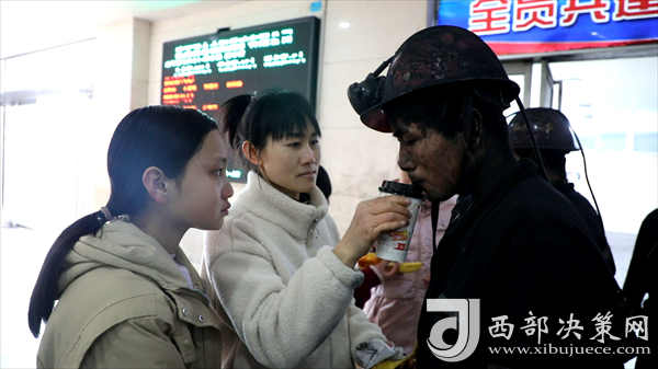 “來啦,都過來了!”“你爸在這呢”不知道哪位礦嫂喊了一聲,大家都向前擠了擠,分別在人群中找尋自己熟悉的親人,她們激動的湊上前去,用手中的濕巾和毛巾替礦工們卸妝濃濃的“工作妝”,把手中的面包、奶茶、香蕉、蘋果送到“黑”爸爸口中。看著一張張黑乎乎的臉龐,幾乎不能辨認的五官,家屬們有的哽咽著,有的眼淚不聽話的流下來,他們把親人的那份辛苦、那份不易看在眼里,疼在心里。