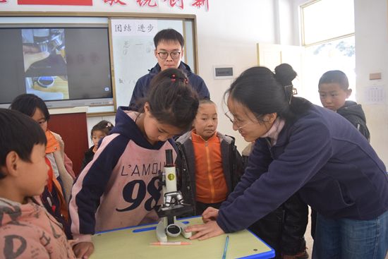 華中農(nóng)業(yè)大學(xué)研支團(tuán)志愿者教學(xué)生們使用顯微鏡。