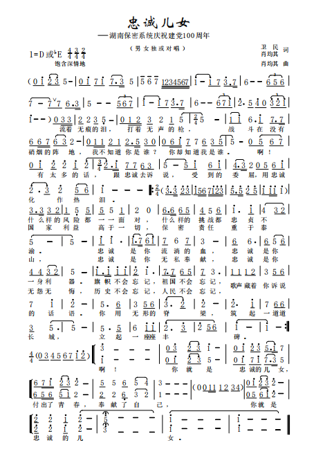 慶祝建黨百年獲獎歌曲作品選集——《忠誠兒女》詞曲。