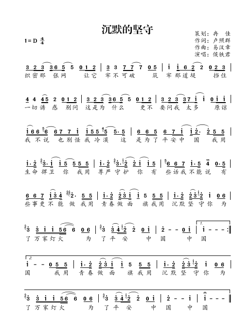 慶祝建黨百年獲獎歌曲作品選集——《沉默的堅守》歌詞。