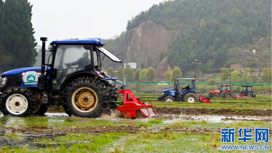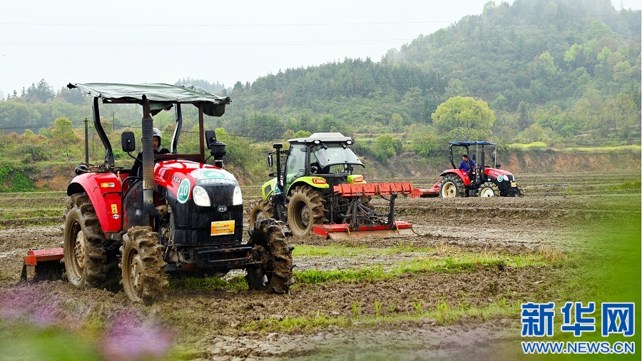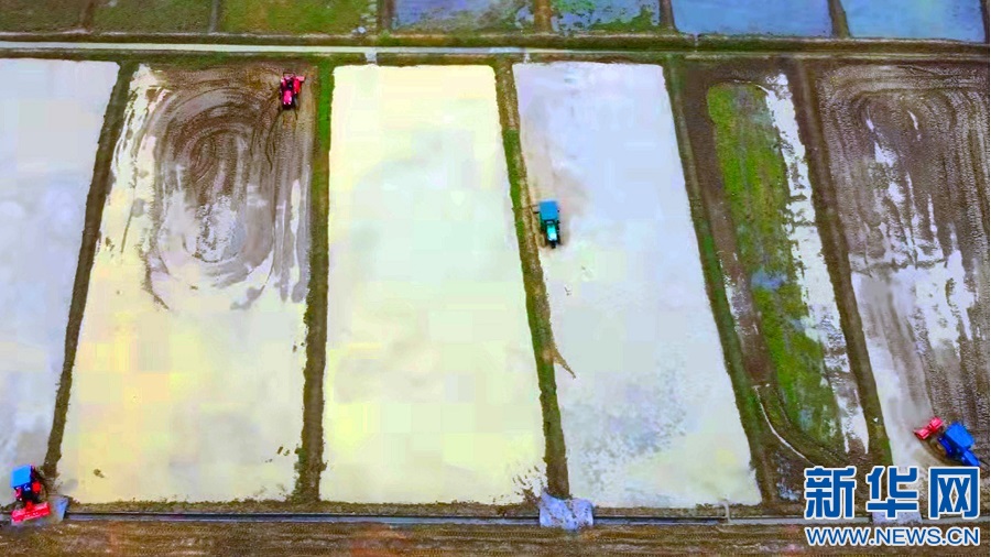 在江西省宜春市袁州區(qū)新田鎮(zhèn)里光村的水田里,數(shù)十臺拖拉機齊上陣,在春天的田野上描繪出一幅幅“鐵牛鬧春圖”。新華網(wǎng)發(fā) 張文 攝